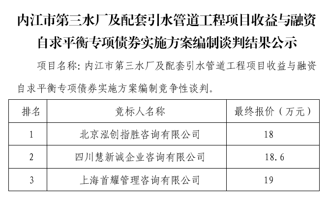 內江市第三水廠(chǎng)及配套引水管道工程項目收益與融資自求平衡專(zhuān)項債券實(shí)施方案編制談判結果公示