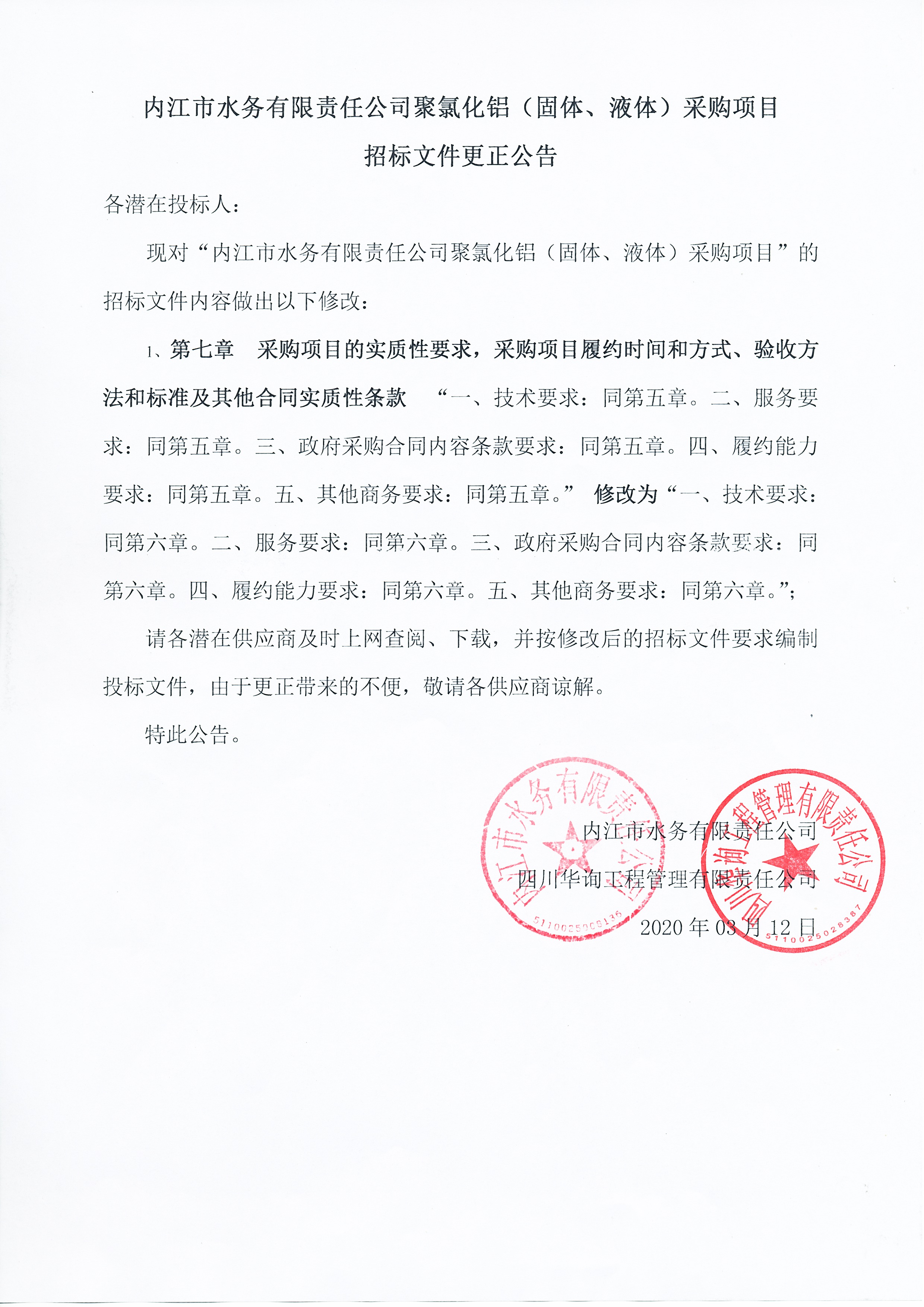內江市水務(wù)有限責任公司聚氯化鋁(固體、液體)采購項目招標文件更正公告