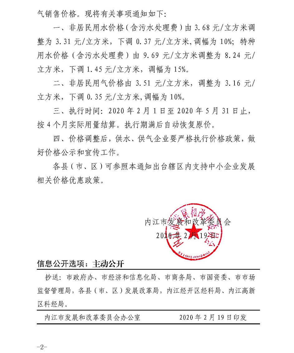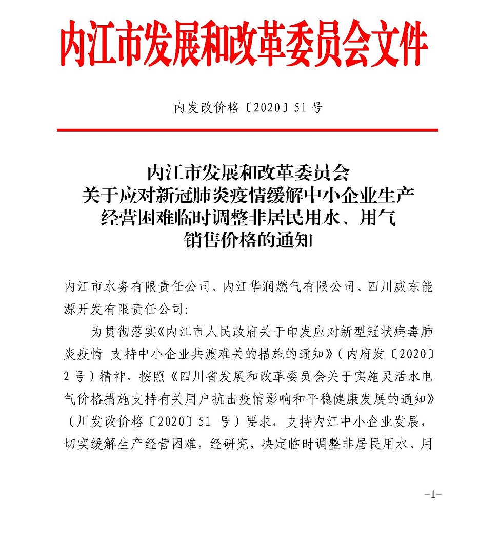 內江市發(fā)展和改革委員會(huì )關(guān)于應對新冠肺炎疫情緩解中小企業(yè)生產(chǎn)經(jīng)營(yíng)困難臨時(shí)調整非居民用水、用氣銷(xiāo)售價(jià)格的通知