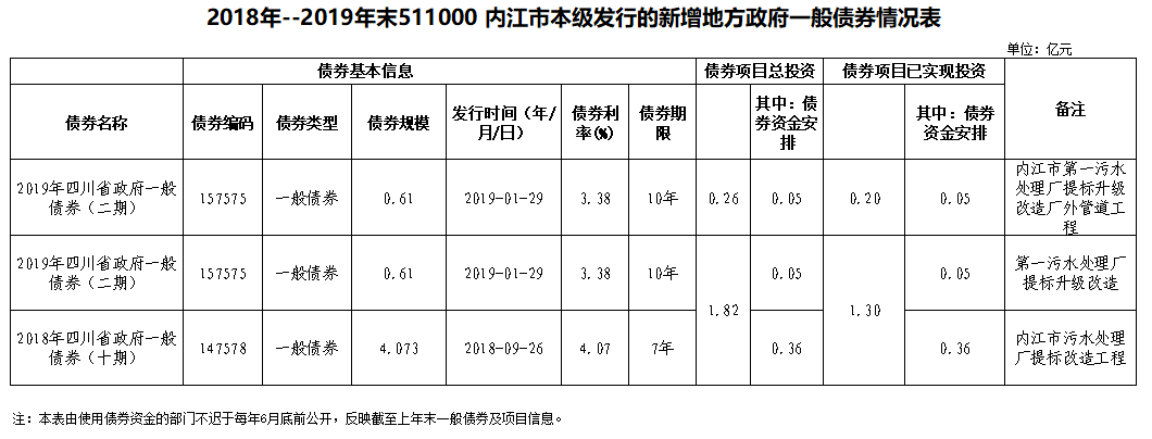 2018年--2019年末511000 內江市本級發(fā)行的新增地方政府一般債券情況表