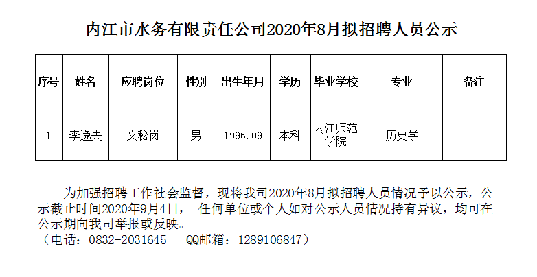 內江市水務(wù)有限責任公司2020年8月擬招聘人員公示