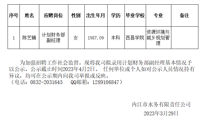 內江市水務(wù)有限責任公司擬錄用計劃財務(wù)部副經(jīng)理公示