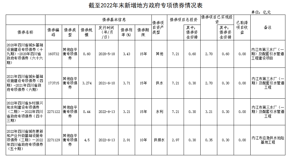 內江市本級截至2022年末新增地方政府債券存續期信息公開(kāi)(水務(wù))