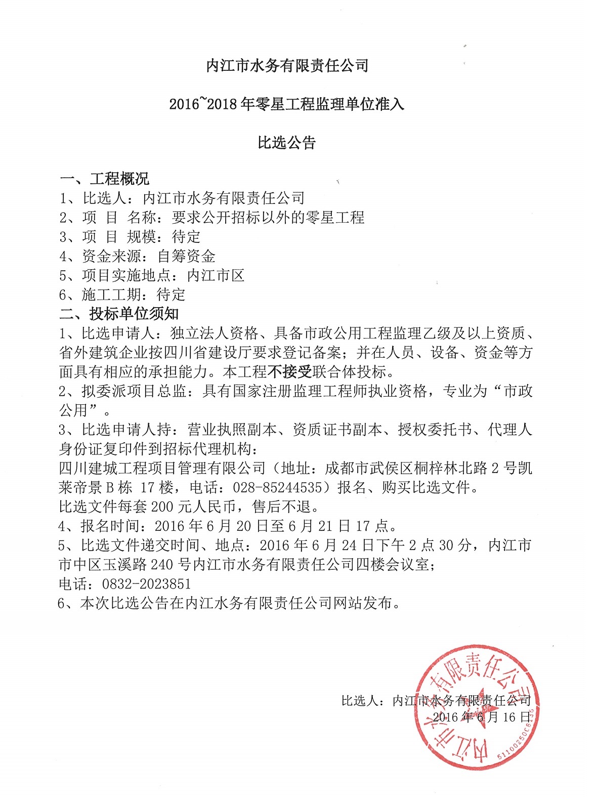 內江市水務(wù)有限責任公司2016~2018年零星工程監理單位準入比選公告