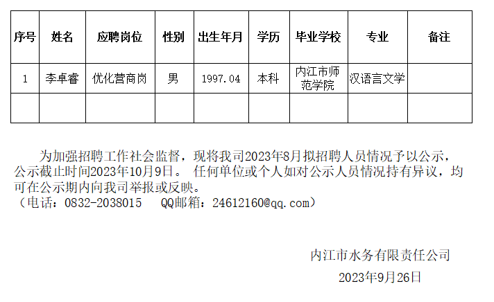 內江市水務(wù)有限責任公司2023年9月擬招聘人員公示