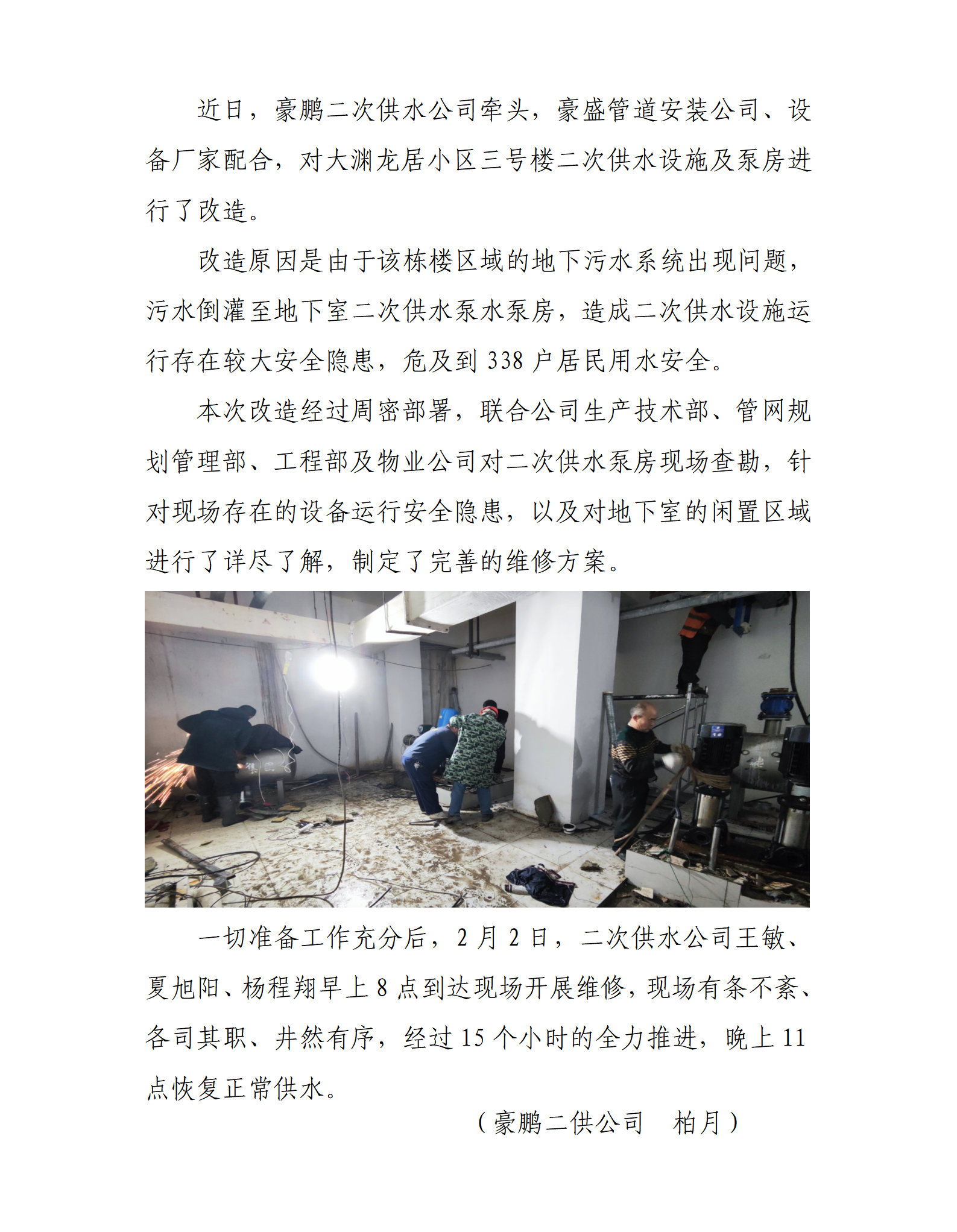 豪鵬公司牽頭對(duì)大淵龍居小區(qū)二次供水設(shè)施及泵房進(jìn)行改造