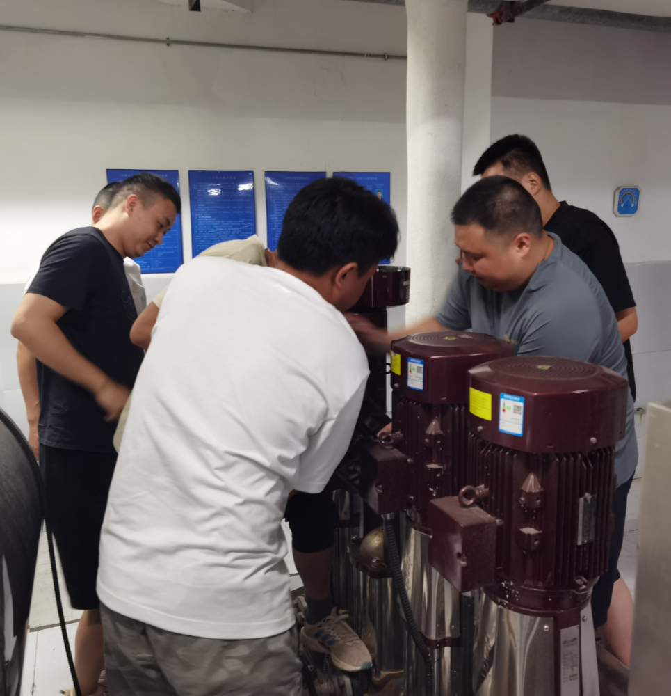 6月中旬,該小區(qū)有用戶反映水壓不穩(wěn)定。豪鵬二次供水公司收到信息立即組織人員前往現(xiàn)場排查,確認是一臺水泵電機出了故障,引發(fā)電壓波動所致。面對突發(fā)情況,公司迅速響應(yīng),立即組織人員對故障電機進行拆解維修。6月17日下午,維修工作進入電機重新安裝的關(guān)鍵階段,公司抓住這次實戰(zhàn)機會,組織5名青年員工參與到此次技術(shù)練兵。通過此次培訓(xùn),員工們不僅掌握了電機維修與安裝的相關(guān)理論和維護技巧,更在實戰(zhàn)中深化了對二次供水設(shè)施運行原理的理解。